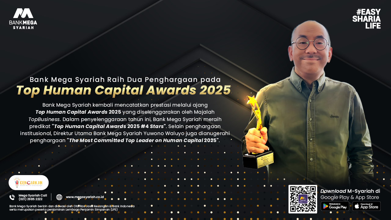 Jakarta – Bank Mega Syariah kembali mencatatkan prestasi melalui ajang Top Human Capital Awards 2025 yang diselenggarakan oleh Majalah TopBusiness. Dalam penyelenggaraan tahun ini, Bank Mega Syariah meraih predikat "Top Human Capital Awards 2025 #4 Stars". Selain penghargaan institusional, Direktur Utama Bank Mega Syariah Yuwono Waluyo juga dianugerahi penghargaan "The Most Committed Top Leader on Human Capital 2025".
