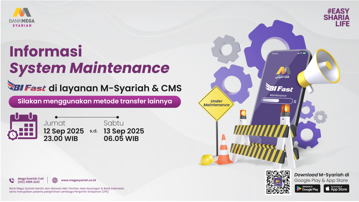 Sehubungan dengan adanya peningkatan kualitas sistem BI Fast di layanan kami, dengan ini kami sampaikan bahwa Bank Mega Syariah akan melakukan pemeliharaan sistem dengan informasi sebagai berikut: