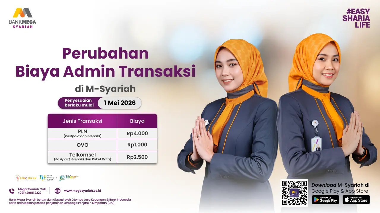 Dalam rangka meningkatkan kualitas layanan digital dan memastikan kenyamanan serta keamanan transaksi yang berkelanjutan bagi seluruh nasabah, Bank Mega Syariah menginformasikan adanya perubahan biaya administrasi untuk transaksi PLN, OVO, dan Telkomsel khusus melalui saluran (channel) M-Syariah.