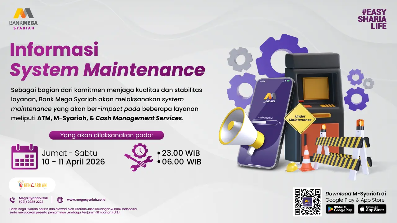 Sehubungan dengan adanya peningkatan kualitas dan stabilitas layanan di layanan kami, dengan ini kami sampaikan bahwa Bank Mega Syariah akan melakukan pemeliharaan sistem dengan informasi sebagai berikut: