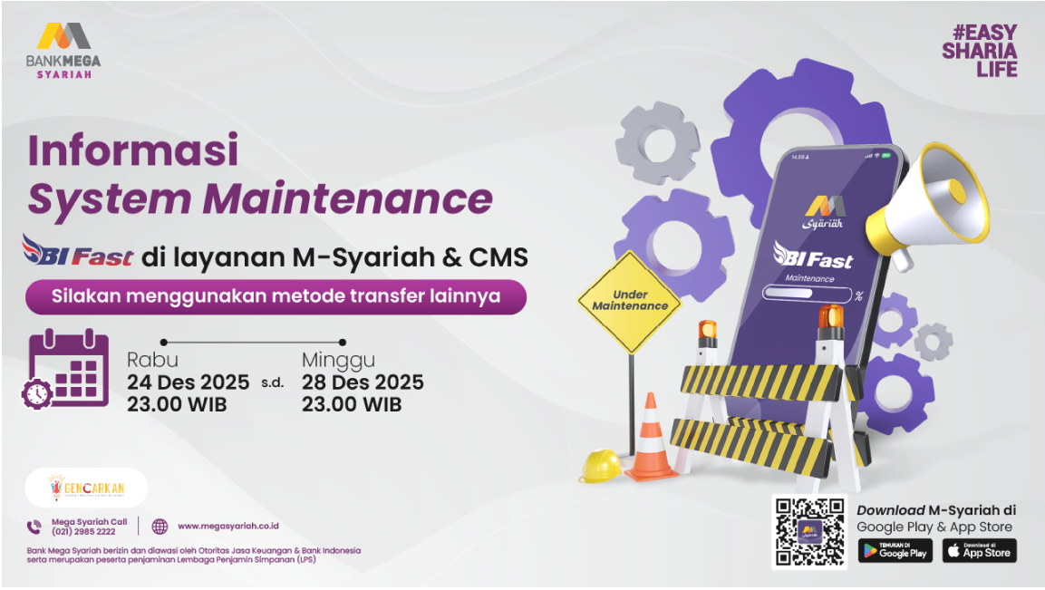 Sehubungan dengan adanya peningkatan kualitas sistem BI Fast di layanan kami, dengan ini kami sampaikan bahwa Bank Mega Syariah akan melakukan pemeliharaan sistem dengan informasi sebagai berikut:
