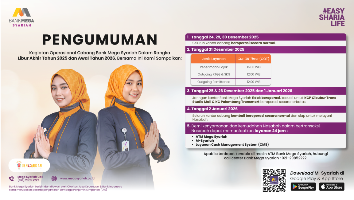Sehubungan dengan libur akhir tahun 2025 dan awal tahun baru 2026, dengan ini kami informasikan kegiatan operasional cabang Bank Mega Syariah bahwa pada tanggal 25 - 26 Desember 2025 dan 1 Januari 2026, seluruh kantor cabang Bank Mega Syariah tidak beroperasi.