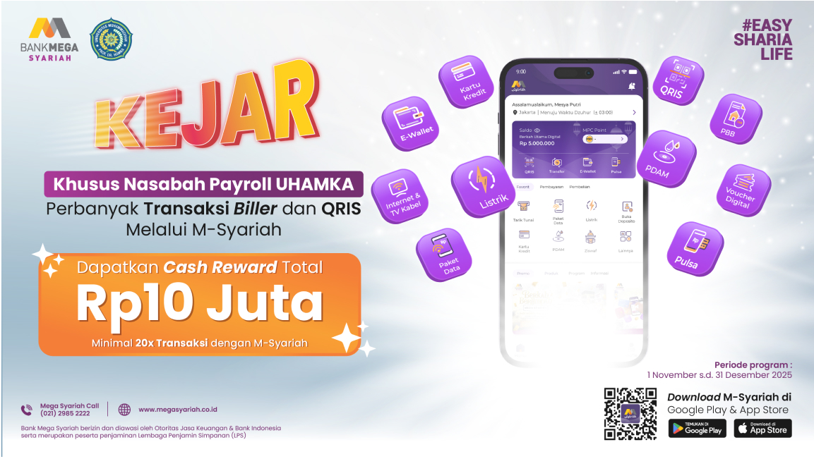 Lewat program Kejar M-Syariah, kamu bisa mendapatkan cash reward dengan total hingga Rp10 Juta dengan bertransaksi menggunakan M-Syariah di berbagai merchant dan biller. Semakin banyak transaksi, semakin besar peluang kamu untuk mendapatkan cash reward-nya.