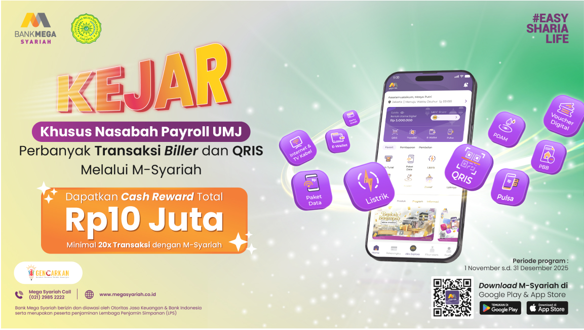 Kabar gembira untuk kamu nasabah Payroll dari Universitas Muhammadiyah Jakarta (UMJ). Dapatkan saldo tambahan di M-Syariah dengan mudah hanya dengan melakukan transaksi sehari-hari!