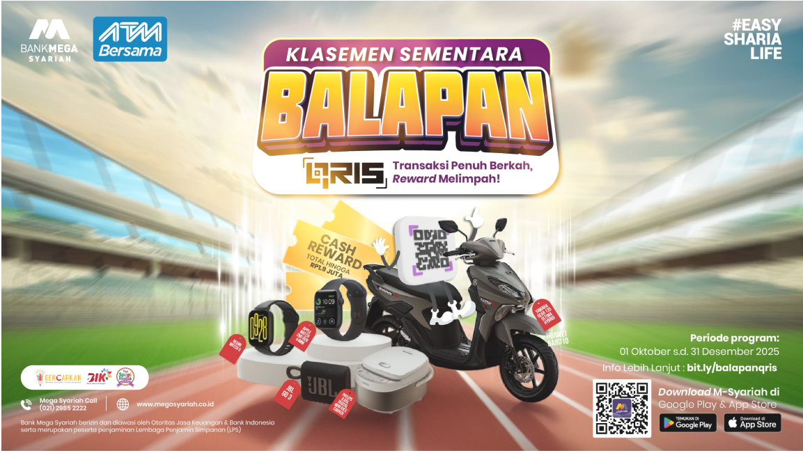 Hati-hati terhadap penipuan. Pastikan kamu hanya mendapat informasi terkait program Balapan QRIS hanya melalui media komunikasi, Instagram, dan Facebook resmi Bank Mega Syariah, ya! Untuk informasi lebih lanjut, kamu bisa menghubungi Mega Syariah Call: (021) 2985 2222.