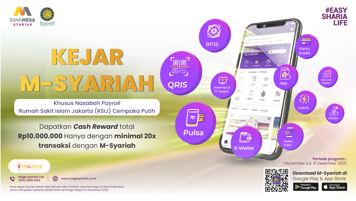 Kabar gembira untuk kamu nasabah Payroll dari Rumah Sakit Islam Jakarta (RSIJ) Cempaka Putih. Raih kesempatan untuk mendapatkan saldo tambahan di M-Syariah dengan mudah hanya dengan melakukan transaksi sehari-hari!