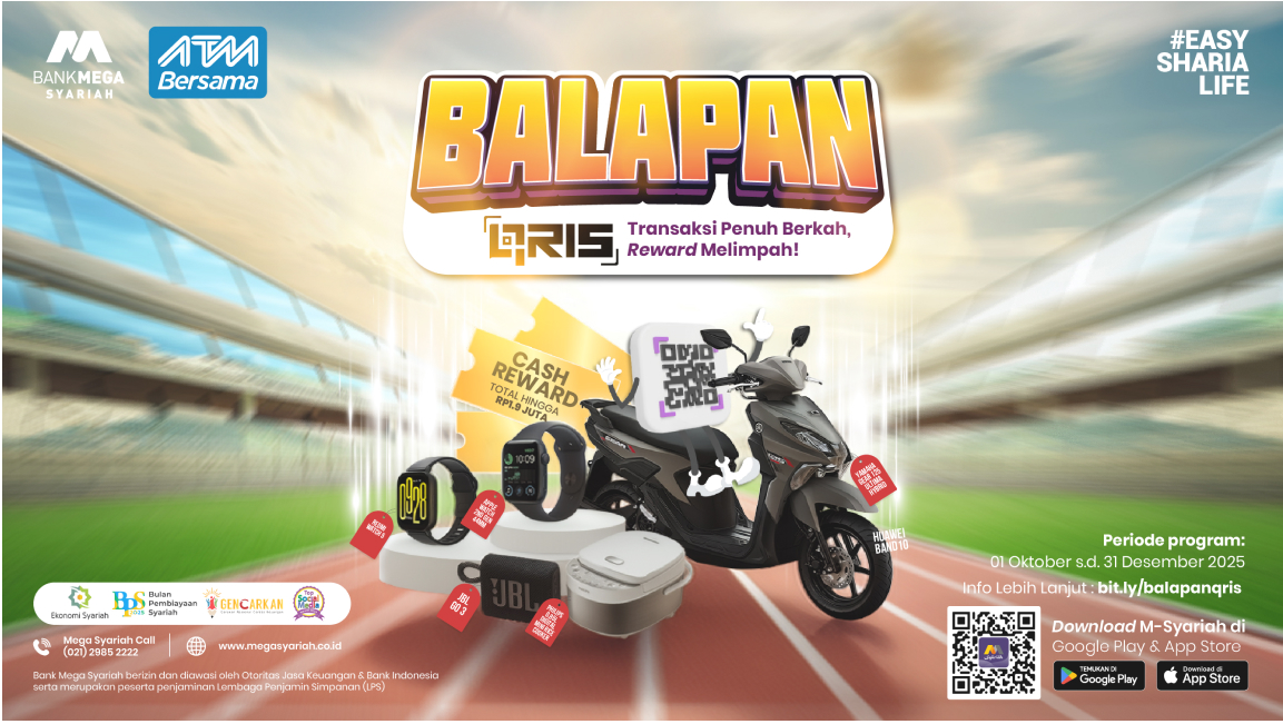Hati-hati terhadap penipuan. Pastikan kamu hanya mendapat informasi terkait program Balapan QRIS hanya melalui media komunikasi, Instagram, dan Facebook resmi Bank Mega Syariah, ya! Untuk informasi lebih lanjut, kamu bisa menghubungi Mega Syariah Call: (021) 2985 2222.