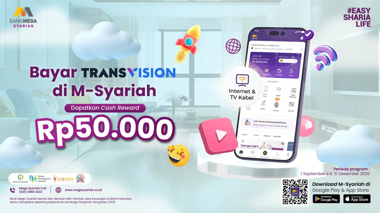 Khusus kamu nasabah setia M-Syariah, ada promo cash reward senilai Rp50.000 untuk transaksi pembayaran Transvision. Penasaran cara dapetin cash rewardnya? Yuk, simak syarat dan ketentuannya sebagai berikut.