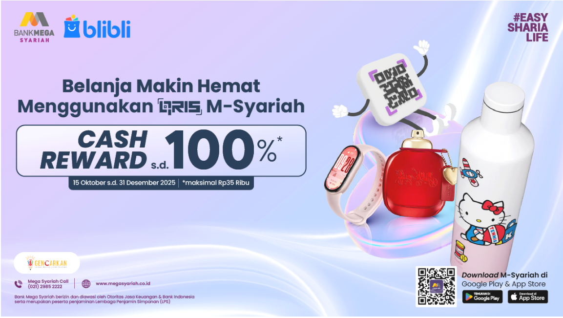 Cash Reward 100% maks. Rp35.000 berlaku khusus untuk nasabah baru Bank Mega Syariah (Nasabah Baru adalah nasabah yang membuka rekening M-Syariah dan bertransaksi QRIS di Blibli pada bulan yang sama.)