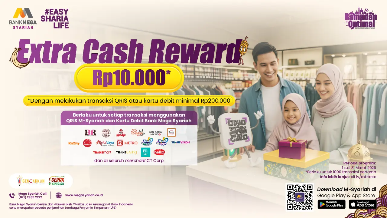 Nikmati extra cash reward 10RB dengan menggunakan QRIS M-Syariah atau Kartu Debit Bank Mega Syariahuntuk pengalaman belanja yang lebih hemat dan menguntungkan. Simak syarat dan ketentuan berikut.