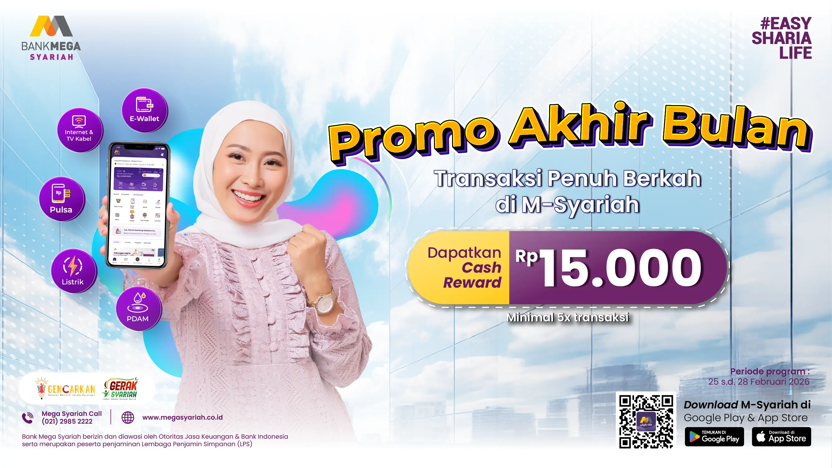 Kamu bisa transaksi apapun dari mulai pengisian e-wallet, isi ulang token, pembelian tiket pesawat, dan lain sebagainya di M-Syariah bisa bikin kamu berkesempatan mendapatkan cash reward hingga Rp15.000.