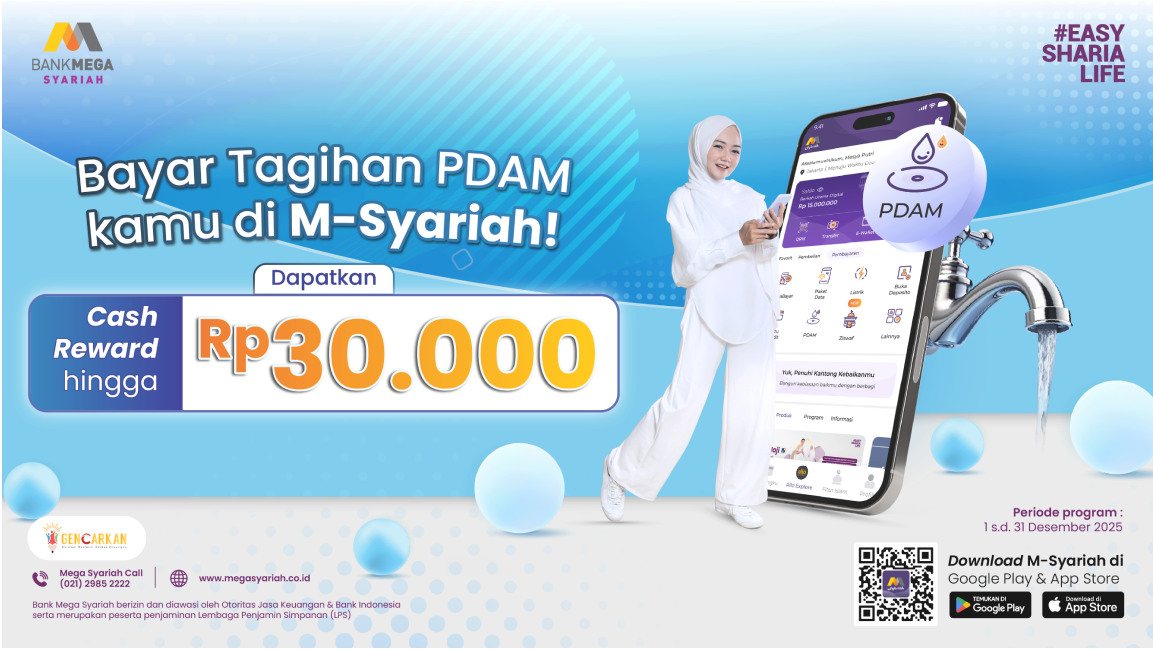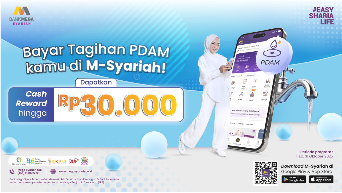 - Minimal 1 kali transaksi pembayaran PDAM di M-Syariah berhak mendapatkan cash reward.