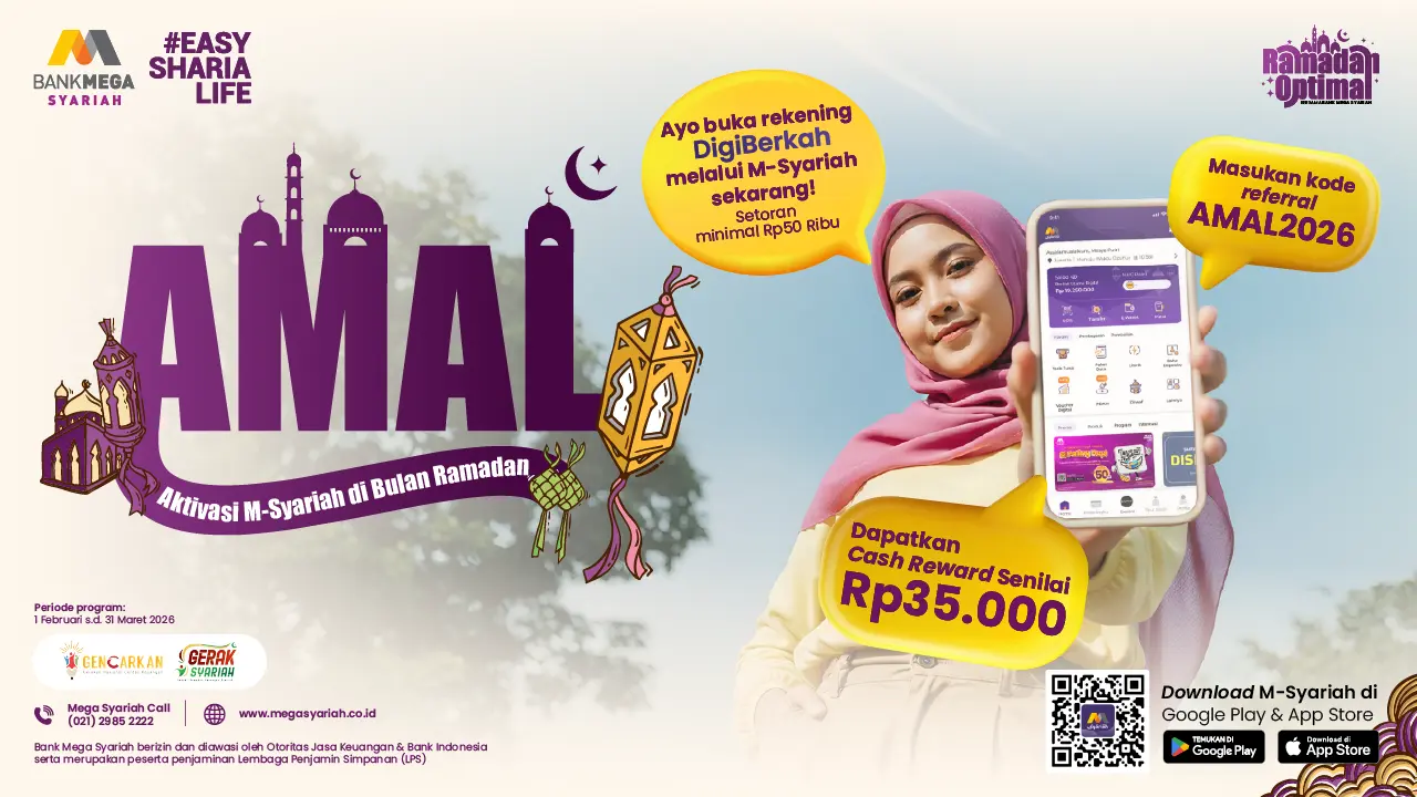 Di bulan suci ramadan 1447 H tahun ini, Bank Mega Syariah hadir membawa kabar gembira! Melalui program AMAL (Aktivasi M-Syariah di Bulan Ramadan), Insan BMS dapat mempermudah urusan ZISWAF dan transaksi harian dengan bonus menguntungkan!