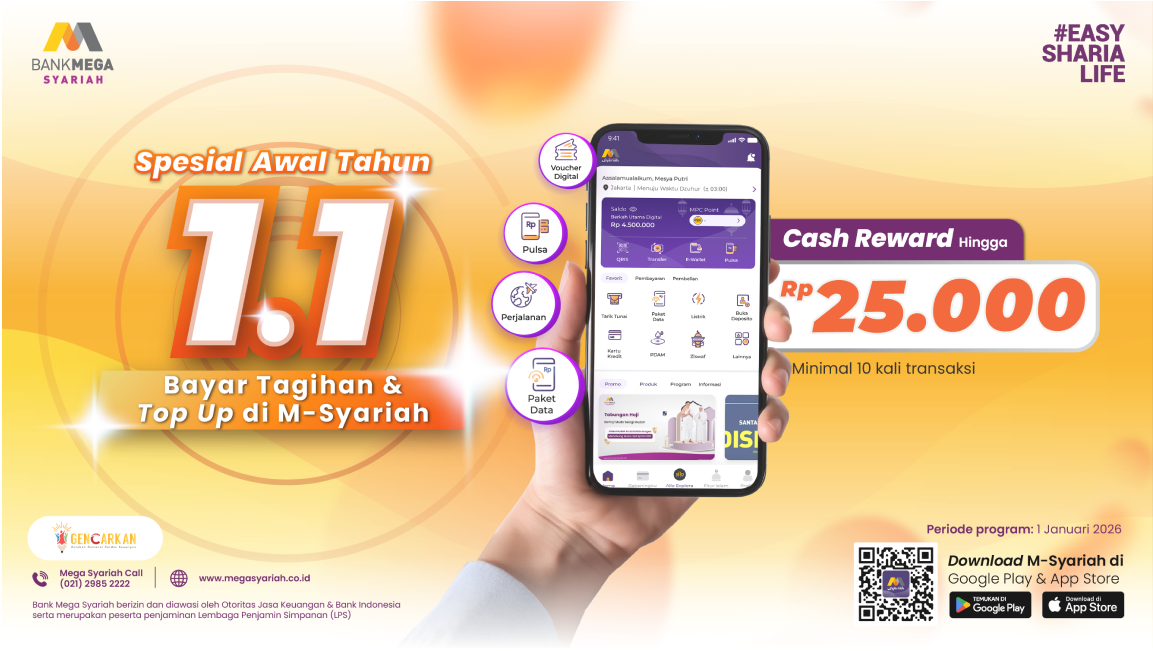 Di awal tahun baru 2026, ada promo menarik dari M-Syariah yang bisa bikin pengeluaranmu jauh lebih hemat! Rayakan momen 1.1 dengan berbagai kemudahan transaksi lewat M-Syariah dari mulai bayar tagihan, pembelian voucher digital, hingga pembayaran tiket pesawat!