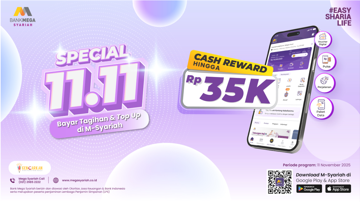 Spesial 11.11 kali ini, kamu bisa nikmati pengalaman bertransaksi yang lebih praktis, cepat, dan hemat untuk berbagai kebutuhan harianmu mulai dari bayar tagihan, top up, hingga pembelian tiket perjalanan melalui M-Syariah dengan bonus cash reward hingga Rp35.000.