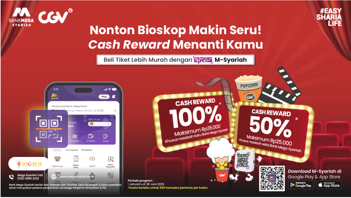 Cash Reward 100% maksimum Rp35 ribu berlaku khusus untuk nasabah baru Bank Mega Syariah. (Nasabah baru adalah nasabah yang membuka rekening M-Syariah dan bertransaksi QRIS di CGV pada bulan yang sama).