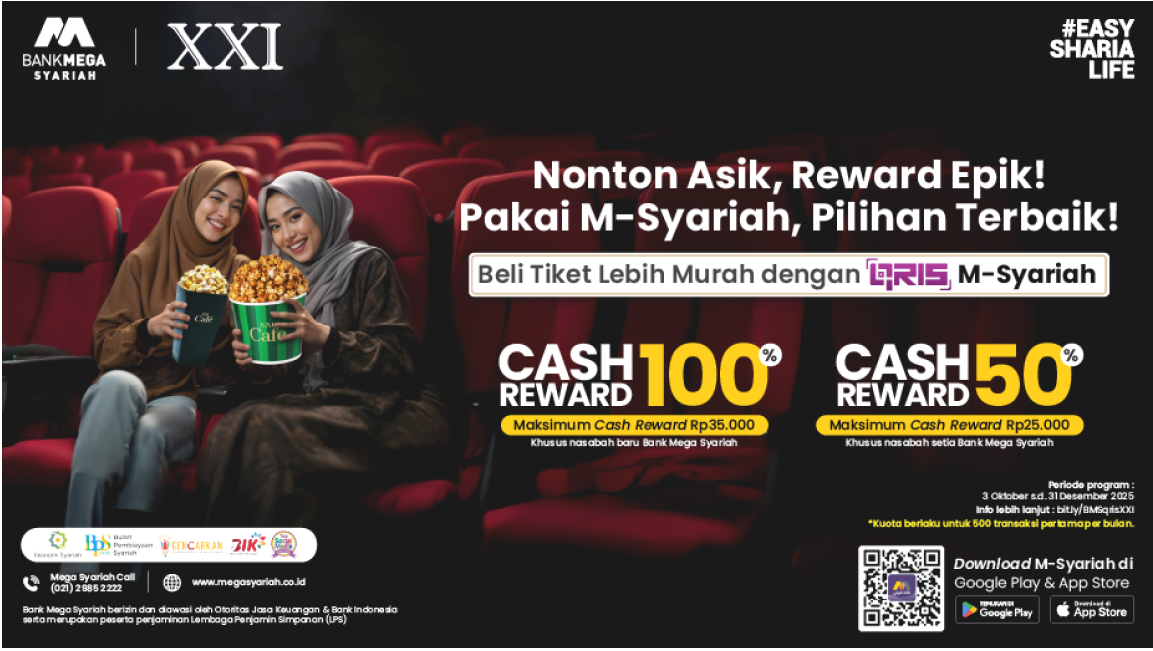 Cash Reward 100% maksimum Rp35 ribu berlaku khusus untuk nasabah baru Bank Mega Syariah. (Nasabah baru adalah nasabah yang membuka rekening M-Syariah dan bertransaksi QRIS di XXI pada bulan yang sama.