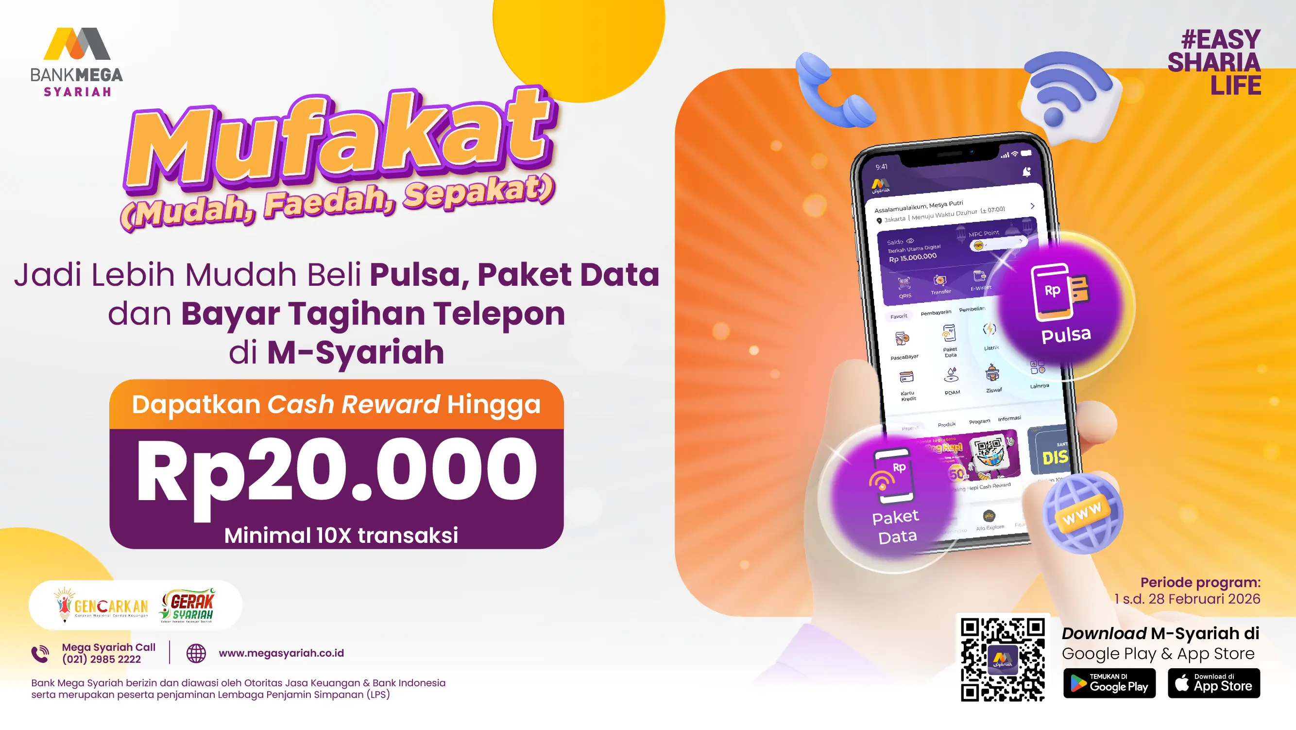 Lewat program ini, kamu berkesempatan mendapatkan cash reward hingga Rp20.000saat melakukan transaksi Telco, baik itu pulsa, pembelian paket data, dan pembayaran tagihan pasca bayar di M-Syariah.