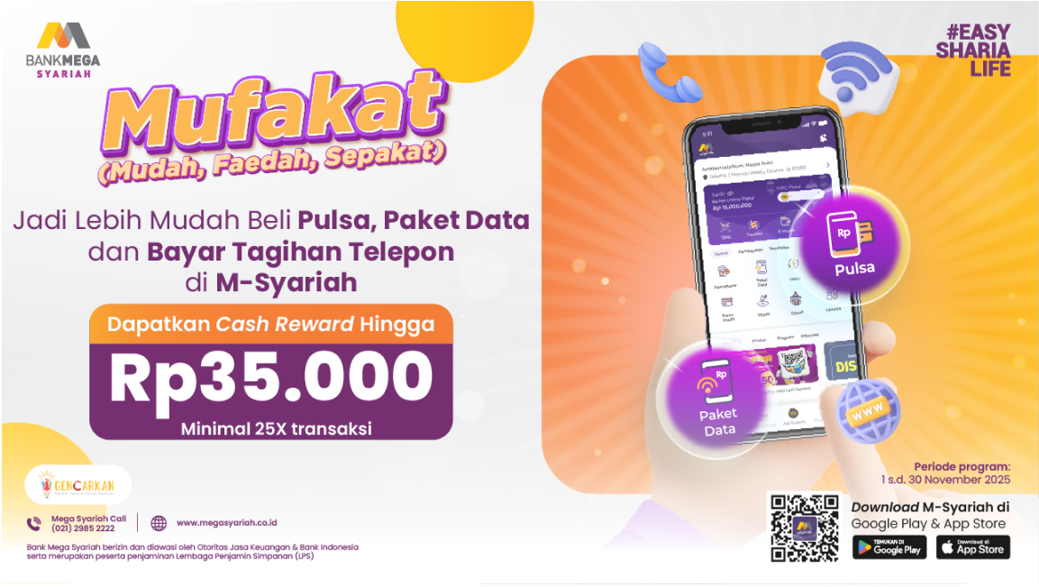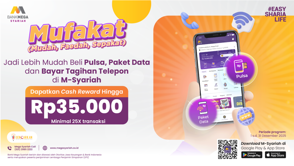 Untuk para pengguna setia maupun pengguna baru M-Syariah, yuk manfaatkan program MUFAKAT TELCO (Isi Pulsa, Beli Paket Data, dan Bayar Tagihan Pasca Bayar) di M-Syariah.
