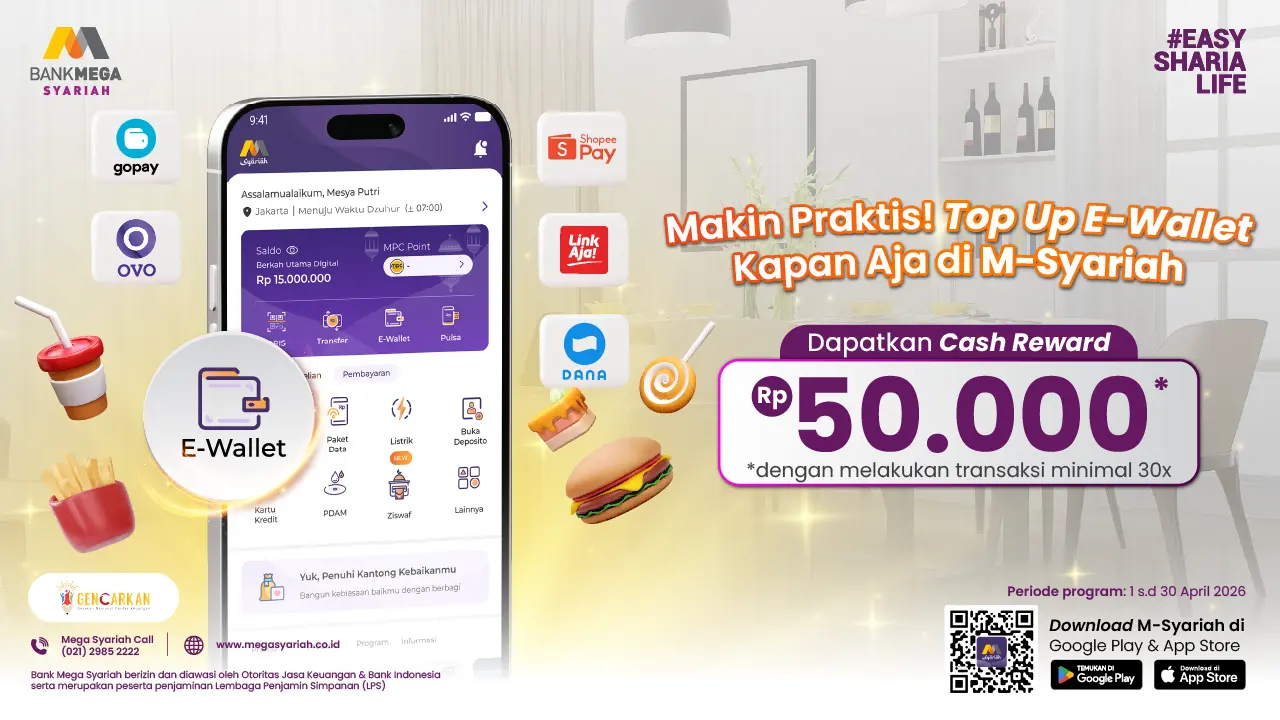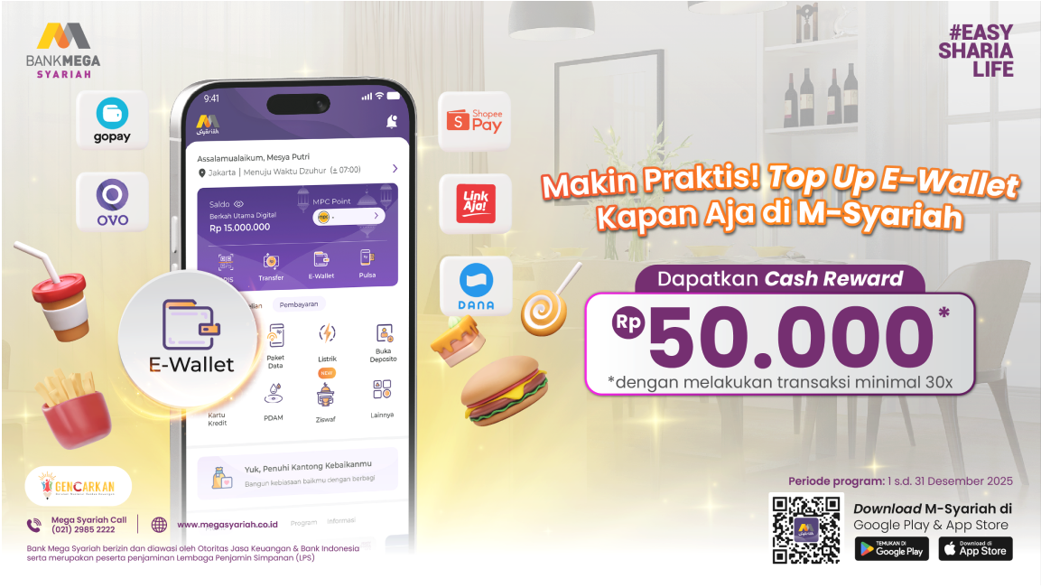 Minimal 30 kali transaksi di M-syariah dari isi ulang E-wallet (Gopay, OVO, Link Aja, Dana, dan ShopeePay) berkesempatan mendapatkan reward program.