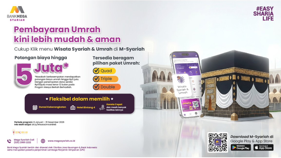 Yuk, jangan tunda niat baik mewujudkan impian ibadah ke tanah suci sekaligus berlibur di berbagai wisata syariah. Segera unduh M-Syariah untuk menikmati kemudahan, keamanan, sekaligus keberkahan melalui program Mesya Berkah Berhadiah!