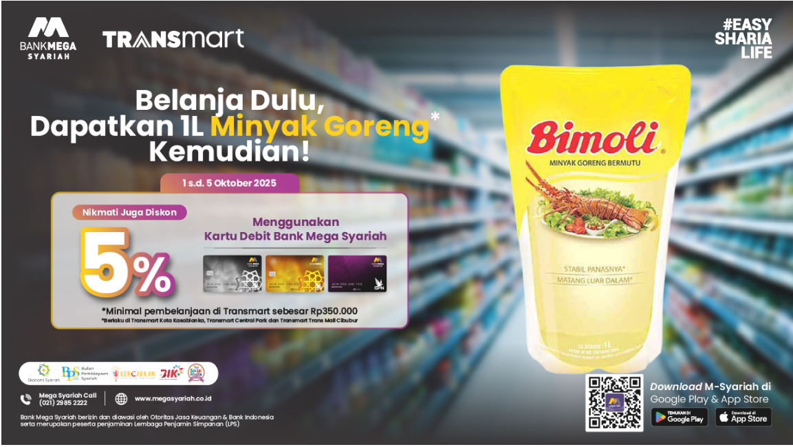Gunakan Kartu Debit Bank Mega Syariah sebagai metode transaksi untuk memanfaatkan diskon 5% ditambah bonus spesial 1 Liter Minyak Goreng dengan syarat dan ketentuan berlaku. Simak informasi lebih lanjut sebagai berikut.
