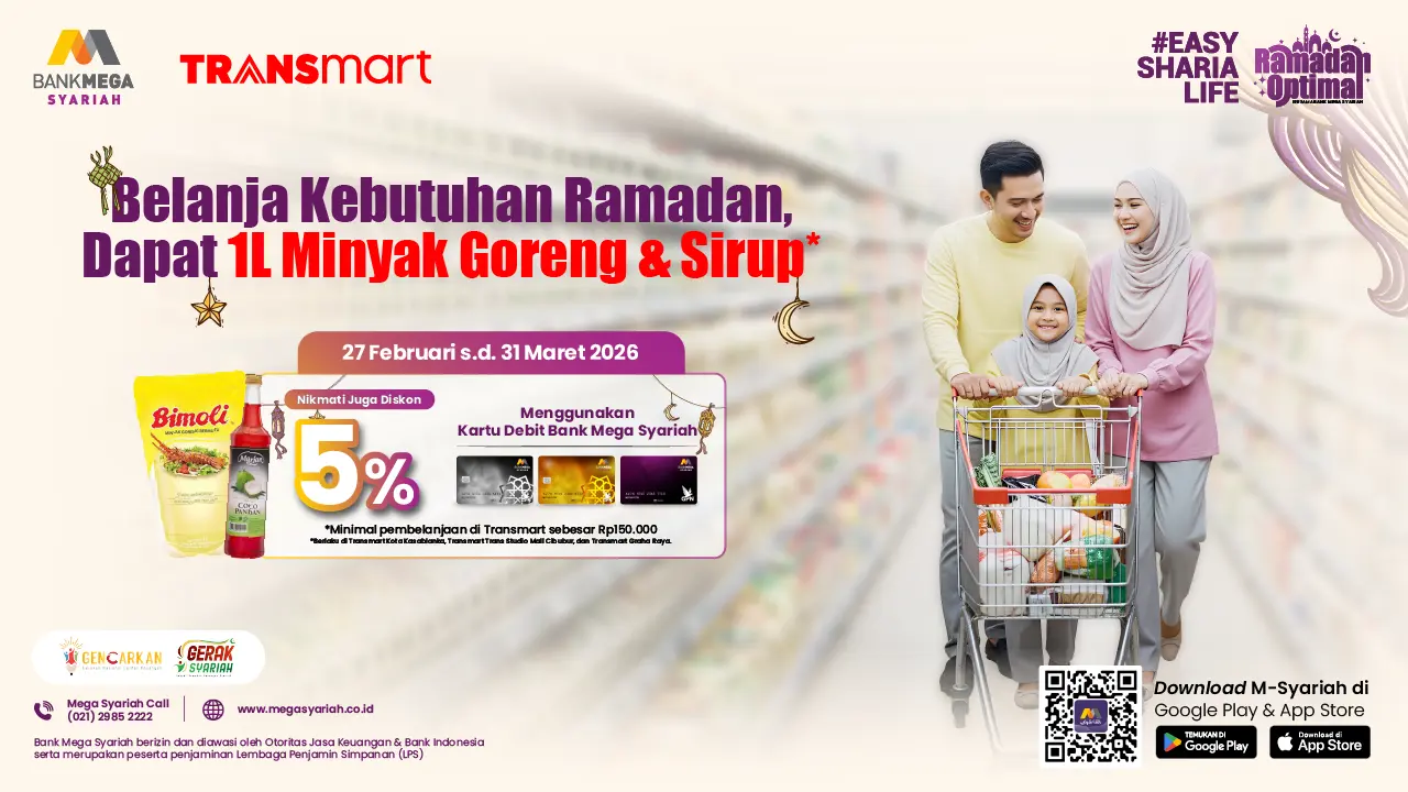 Ayo langsung ajak keluarga dan orang terdekat untuk belanja kebutuhan Ramadan di Transmart terdekat dan dapatnya banyak promonya dari Kartu Debit Bank Mega Syariah! Jangan sampai ketinggalan, periode promo terbatas.
