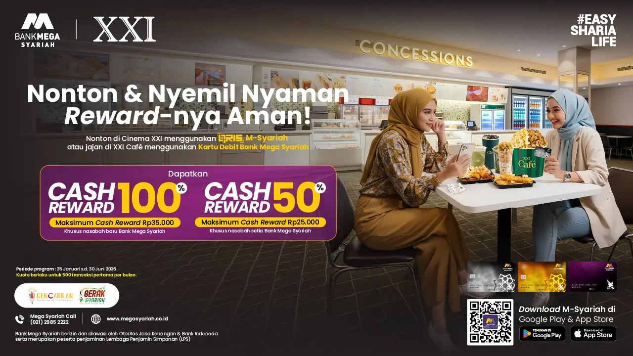 Cash Reward 100% maks. Rp 35rb berlaku khusus untuk nasabah baru Bank Mega Syariah (Nasabah Baru adalah nasabah yang membuka rekening Bank Mega Syariah dan bertransaksi Kartu Debit di XXI Cafe pada bulan yang sama.)