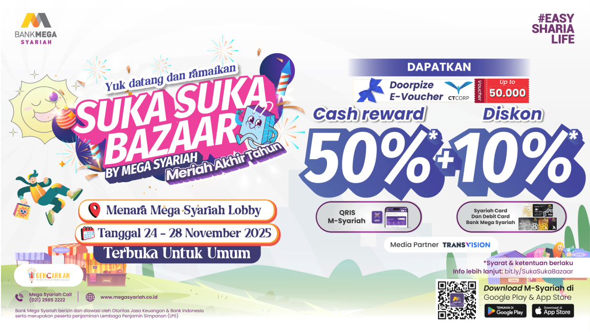 Yuk, penuhi kebutuhan akhir tahunmu dengan mempersiapkan amunisi dompet untuk belanja super hemat di Suka Suka Bazaar by Mega Syariah!