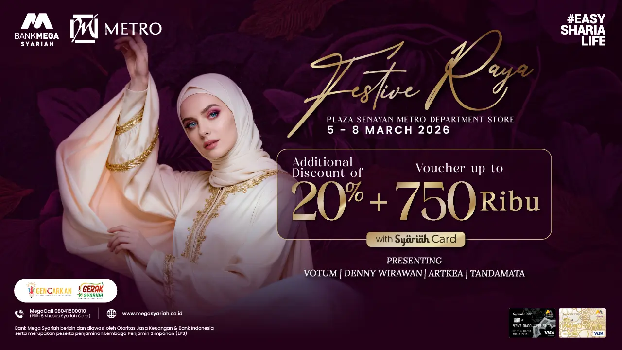 Manfaatkan tambahan promo diskon 20% & free voucher METRO up to 750K Festive Raya Fashion Show khusus untuk nasabah Syariah Card dari Bank Mega Syariah. Simak syarat dan ketentuan berikut.