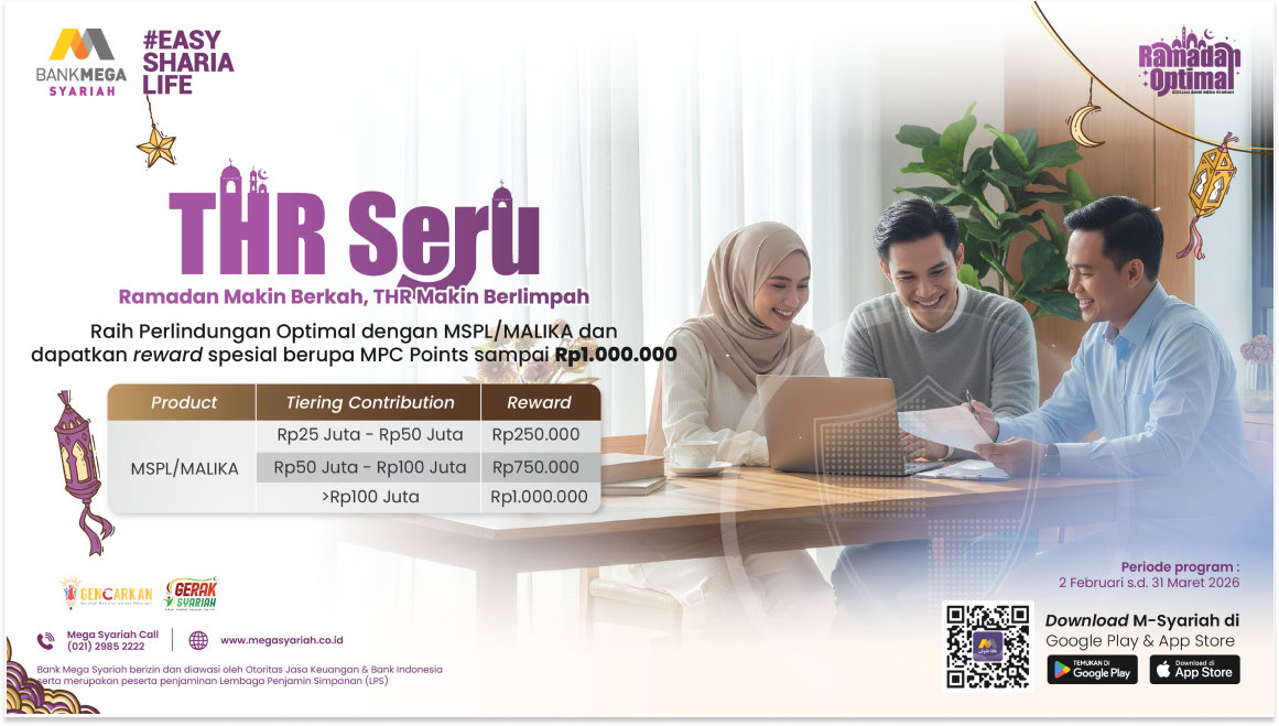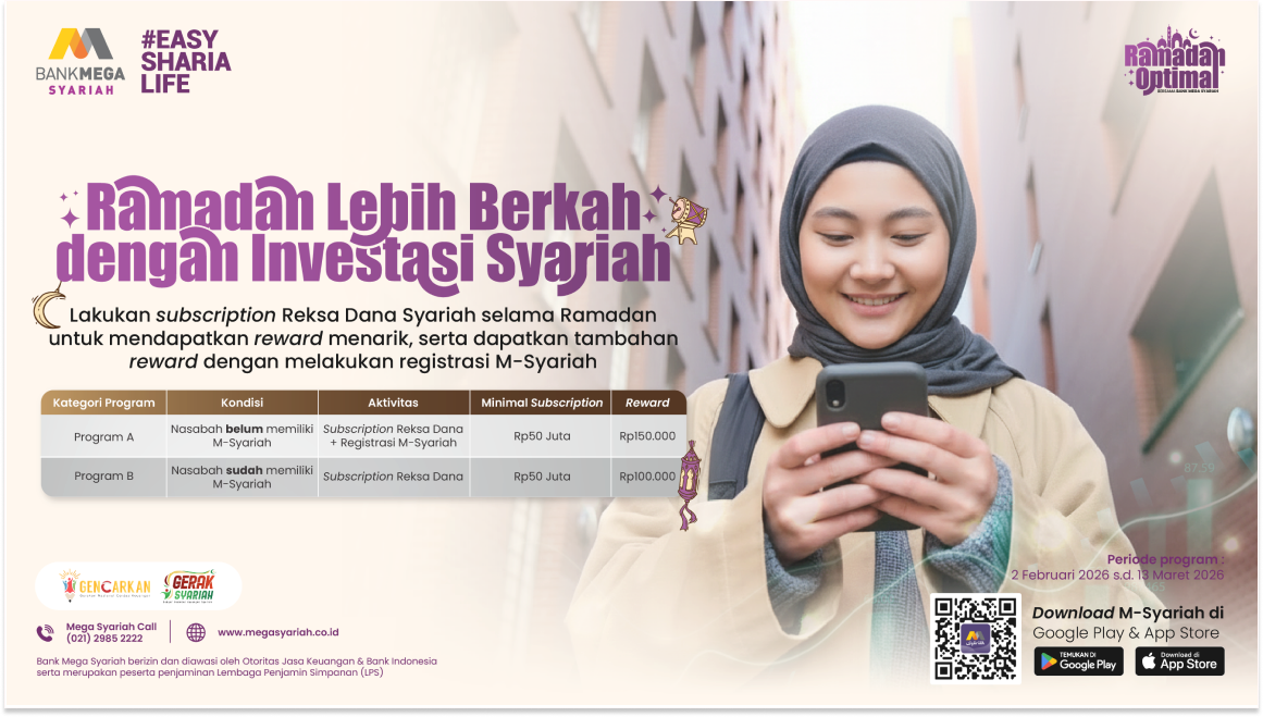 Untuk informasi lebih lanjut, hubungi Mega Syariah Call di nomor (021) 2985 2222 atau customercare@megasyariah.co.id.