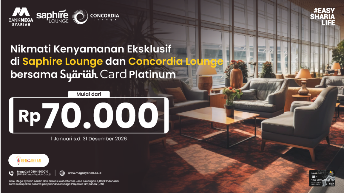 Semua fasilitas airport lounge tersebut dapat Anda nikmati dengan harga spesial mulai dari Rp70.000 menggunakan kartu pembiayaan syariah dari Bank Mega Syariah.
