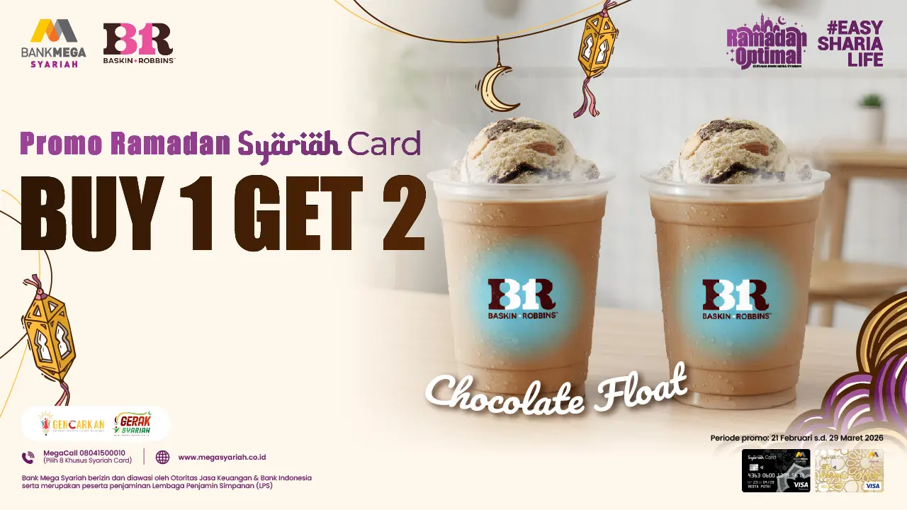 Yuk, tunggu apalagi? Segera serbu promo Berkah Ramadan ini di Baskin Robbins terdekat di kotamu dan nikmati Free Chocolate Float hanya dengan transaksi menggunakan Syariah Card.