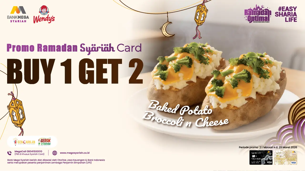 Yuk, tunggu apalagi? Segera serbu promo Berkah Ramadan ini di Wendy's terdekat di kotamu dan nikmati Free Takjil Baked Potato Broccoli n Cheese hanya dengan transaksi menggunakan Syariah Card.