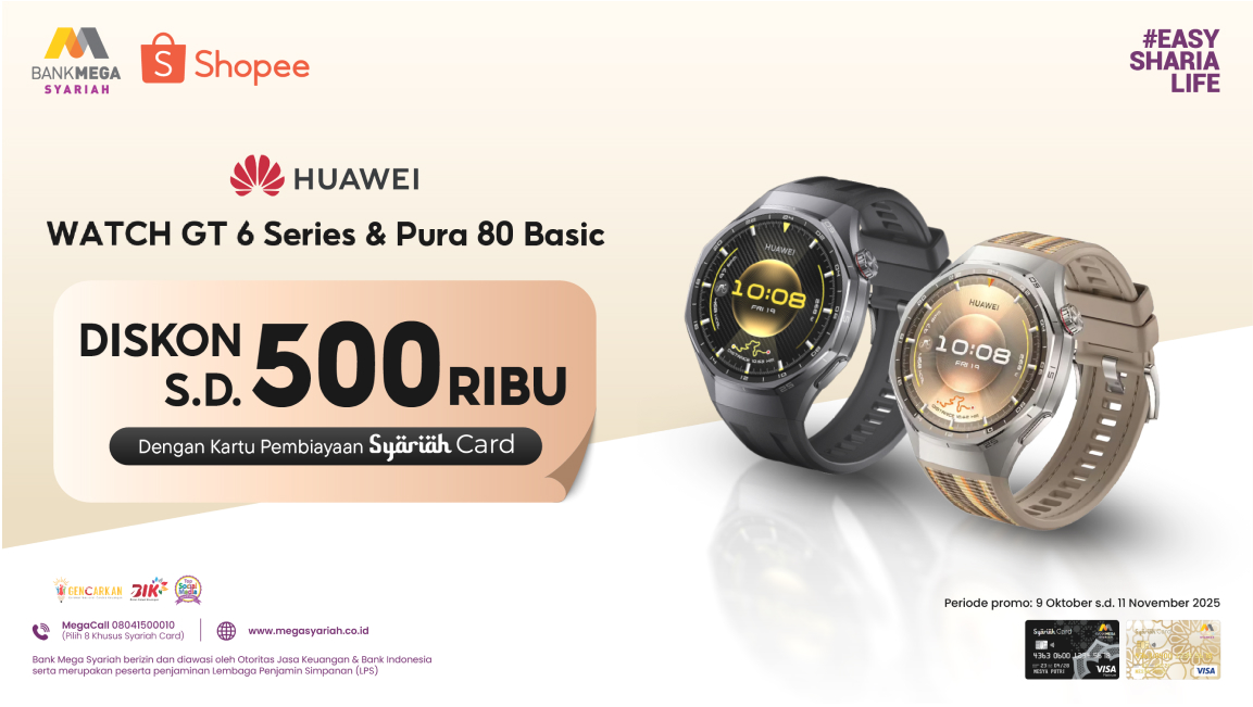 Yuk, nikmati diskon menarik dari Syariah Card dan wujudkan jam tangan impianmu dengan HUAWEI Huawei Watch GT 6 & HUAWEI Pura 80 Basic!