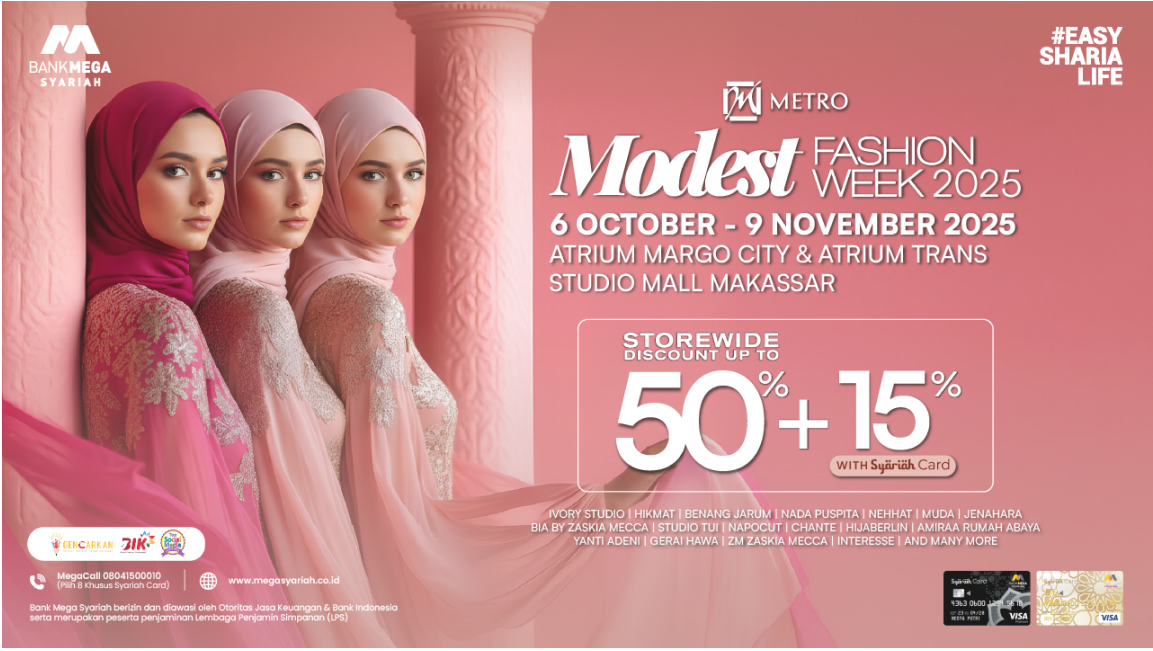 Tambahan diskon 15% untuk pengguna Syariah Card di event Metro Modest Fashion Week 2025.