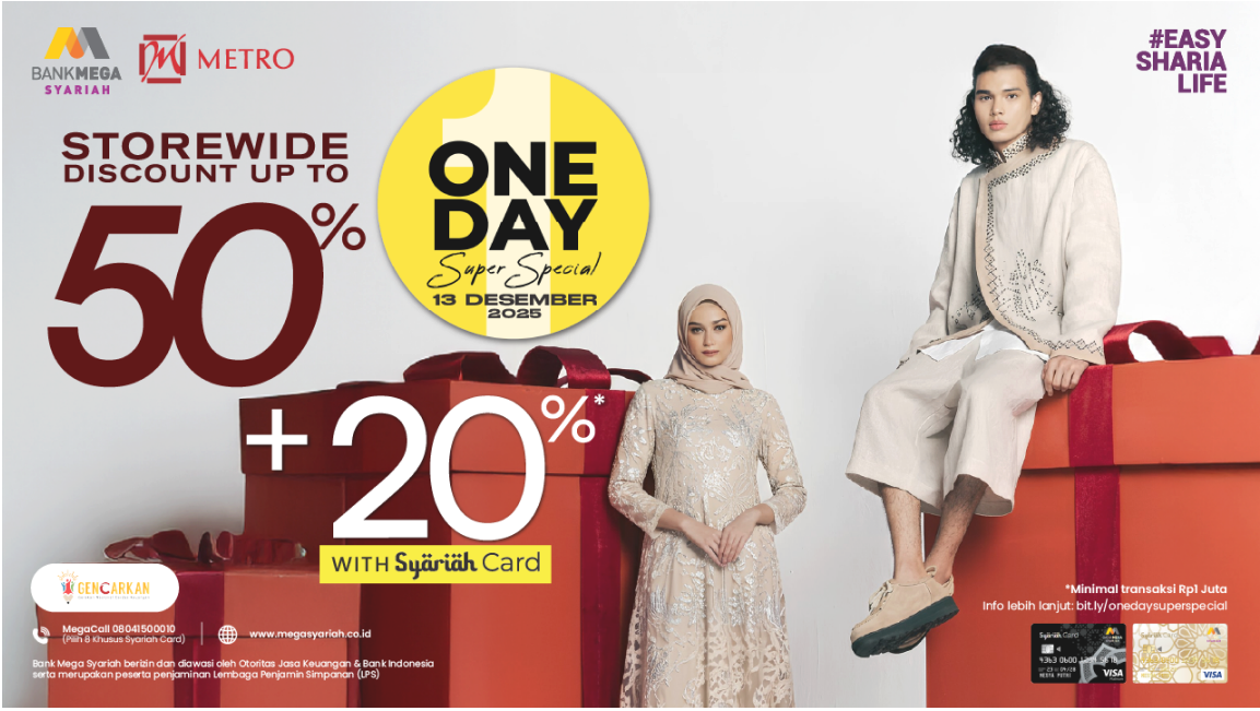 Jangan lupa juga untuk memanfaatkan diskon tambahan sebesar 20% khusus untuk nasabah Syariah Card dari Bank Mega Syariah! Program Metro One Day Super Special hanya berlaku dari hari Sabtu, 13 Desember 2025 di seluruh outlet METRO.