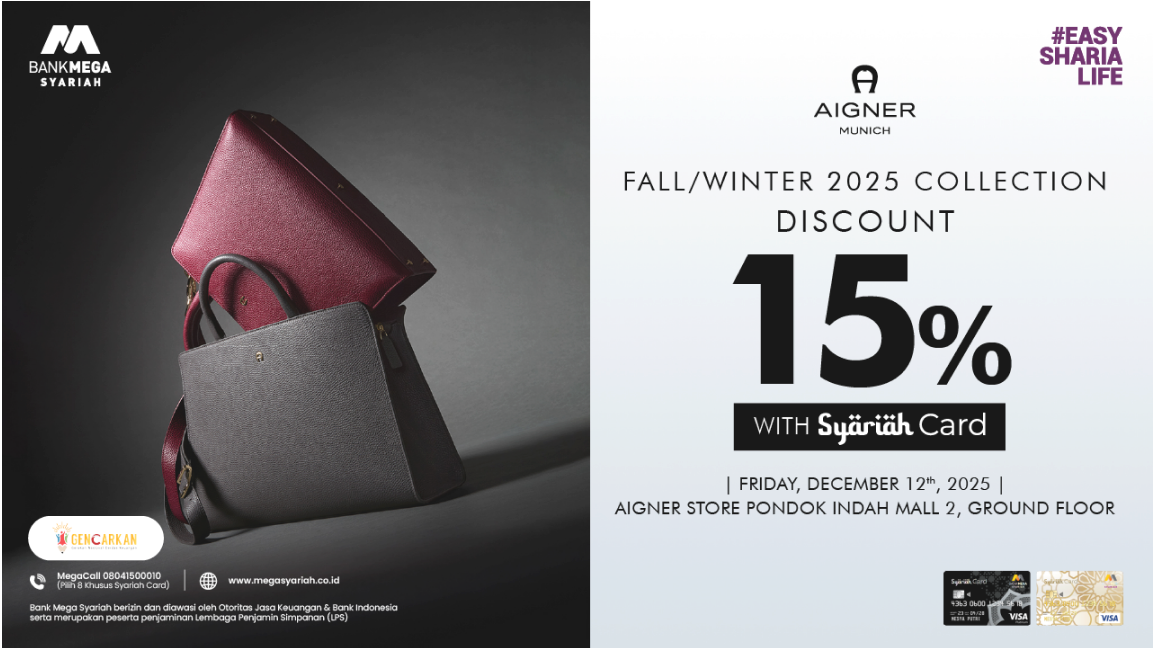 Manfaatkan promo spesial diskon 15% di Aigner Store Pondok Indah Mall 2 hanya dengan bertransaksi menggunakan Syariah Card. Promo ini berlaku terbatas, jadi jangan sampai ketinggalan!