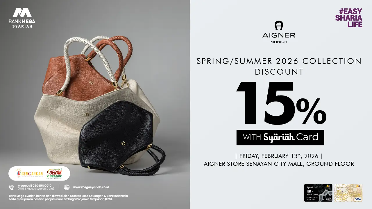 Manfaatkan promo spesial Pay 1 For 2 + Diskon 15% di Aigner Store Senayan City Mall hanya dengan bertransaksi menggunakan Syariah Card. Promo ini berlaku terbatas, jadi jangan sampai ketinggalan!