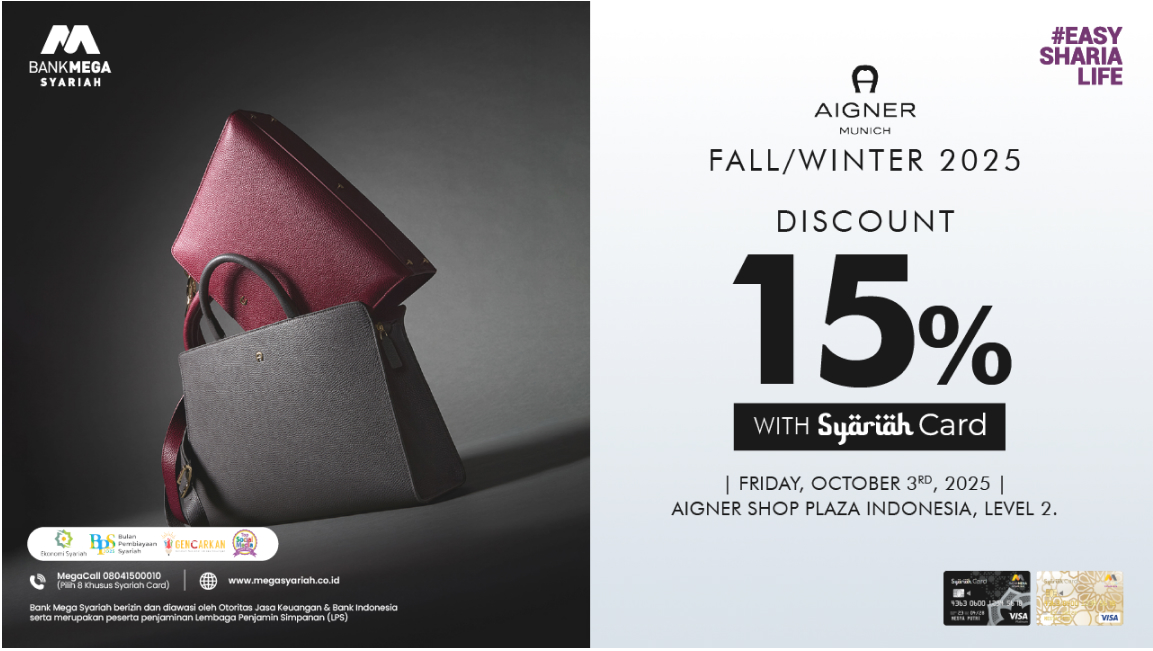 Manfaatkan promo spesial diskon 15% di Aigner Plaza Indonesia hanya dengan bertransaksi menggunakan Syariah Card. Promo ini berlaku terbatas, jadi jangan sampai ketinggalan!