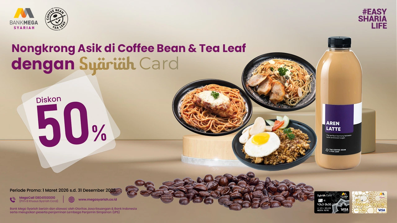 Buat kamu pemilik kartu pembiayaan Syariah (Syariah Card), manfaatkan promo 50% di The Coffee Bean & Tea Leaf.