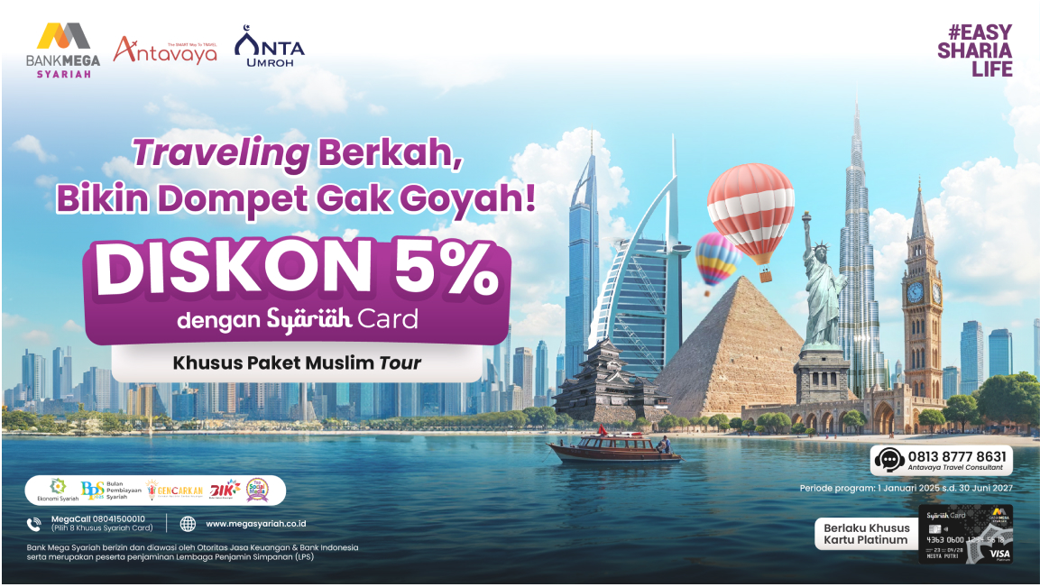 Spesial untuk kamu pengguna Syariah Card, manfaatkan promo Muslim Tour bersama Antavaya. Jelajahi berbagai destinasi menarik dengan harga promo yang akan bikin liburanmu menjadi lebih hemat.