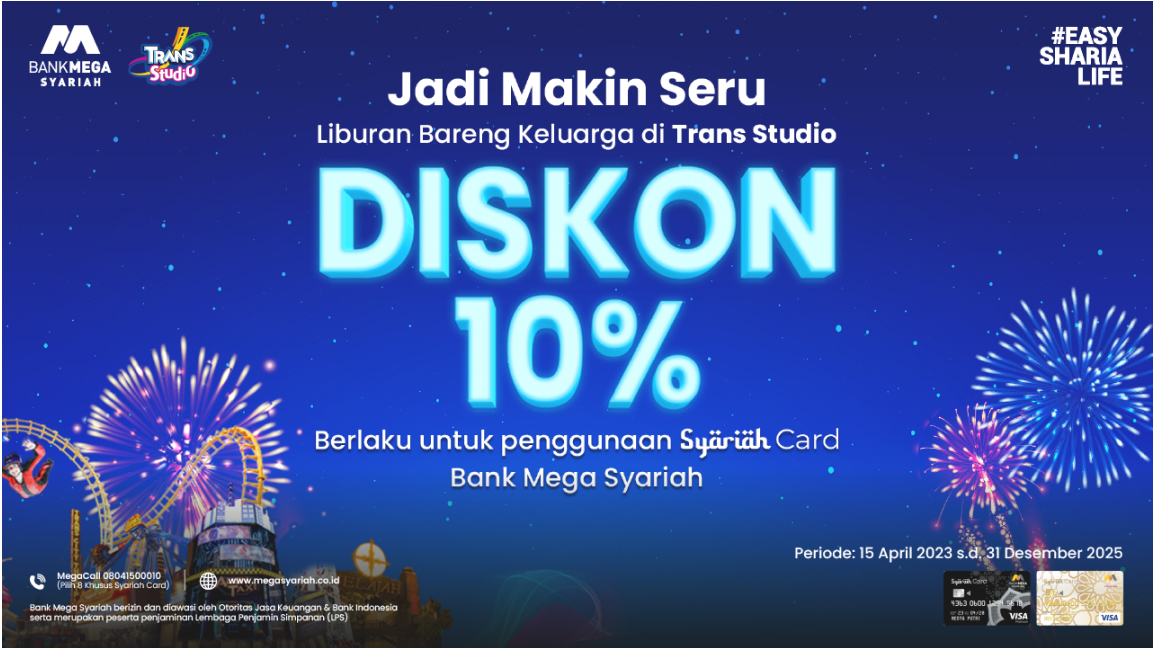 Jadikan liburan makin berkesan dengan memanfaatkan promo diskon 10% untuk pembelian tiket masuk di outlet Trans Studio dari Syariah Card.