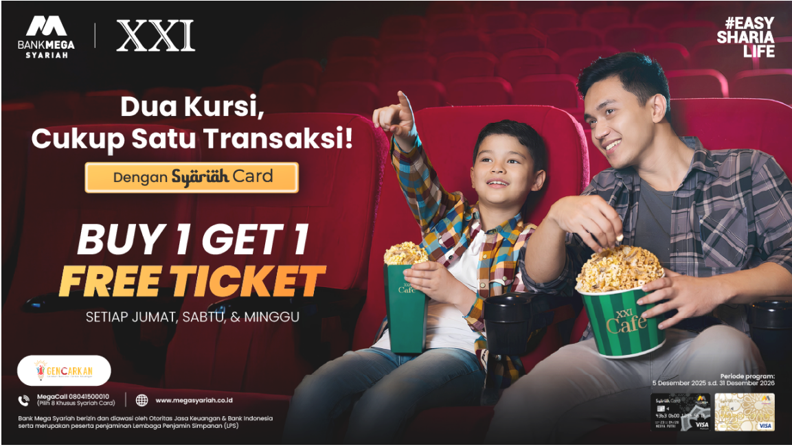 Tunggu apalagi? Yuk, langsung saja ke XXI terdekat di kota mu dan saksikan beragam film favoritmu dengan promo Buy 1 Get 1 dari Syariah Card!