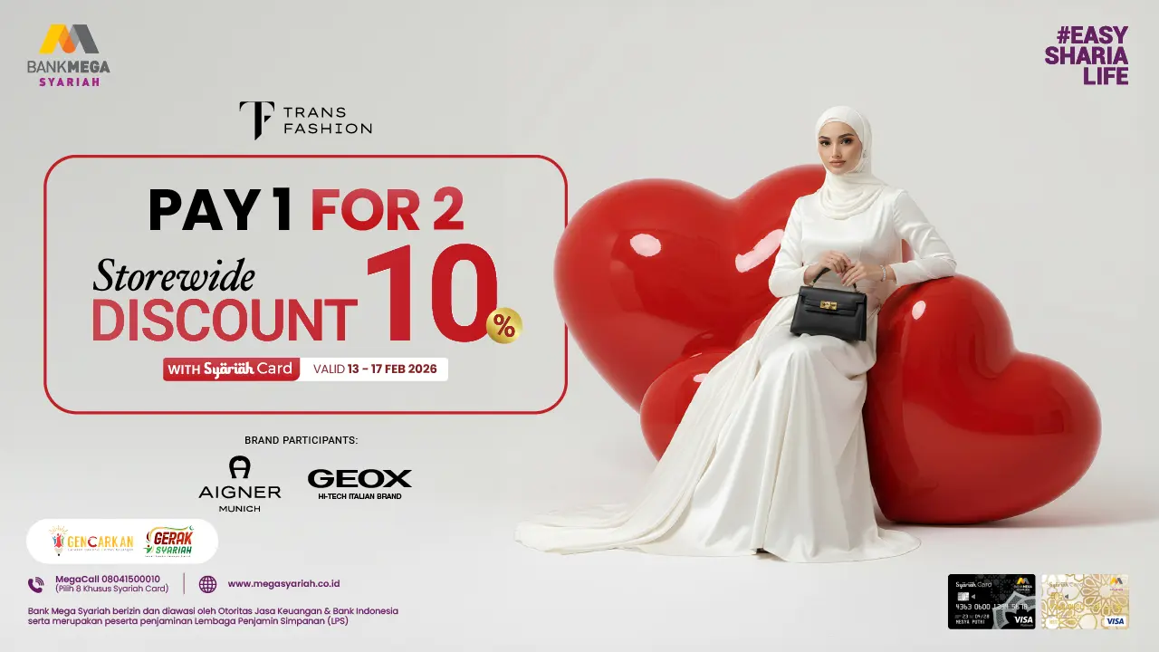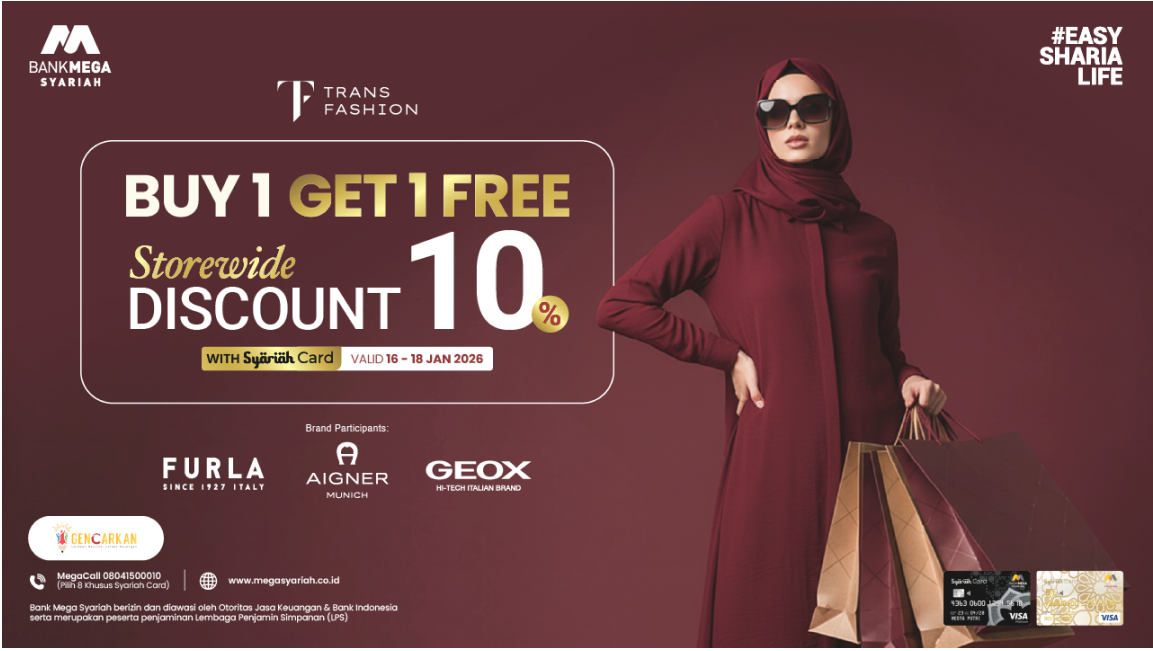 Yuk, belanja berbagai barang branded di Trans Fashion Indonesia dan dapatkan diskon menariknya. Jangan lupa untuk gunakan Syariah Card agar transaksi lebih mudah dan menguntungkan!