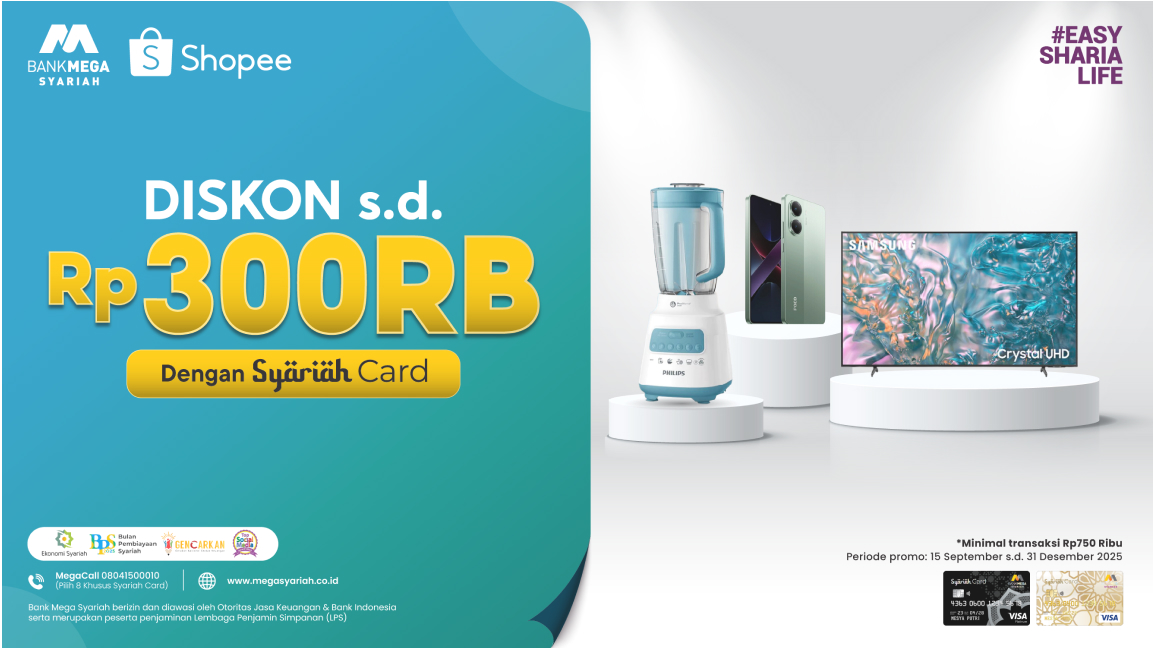 Yuk, segera belanja berbagai produk elektronik favorit-mu di Shopee dengan diskon 7% maksimal Rp300.000 dari Syariah Card.