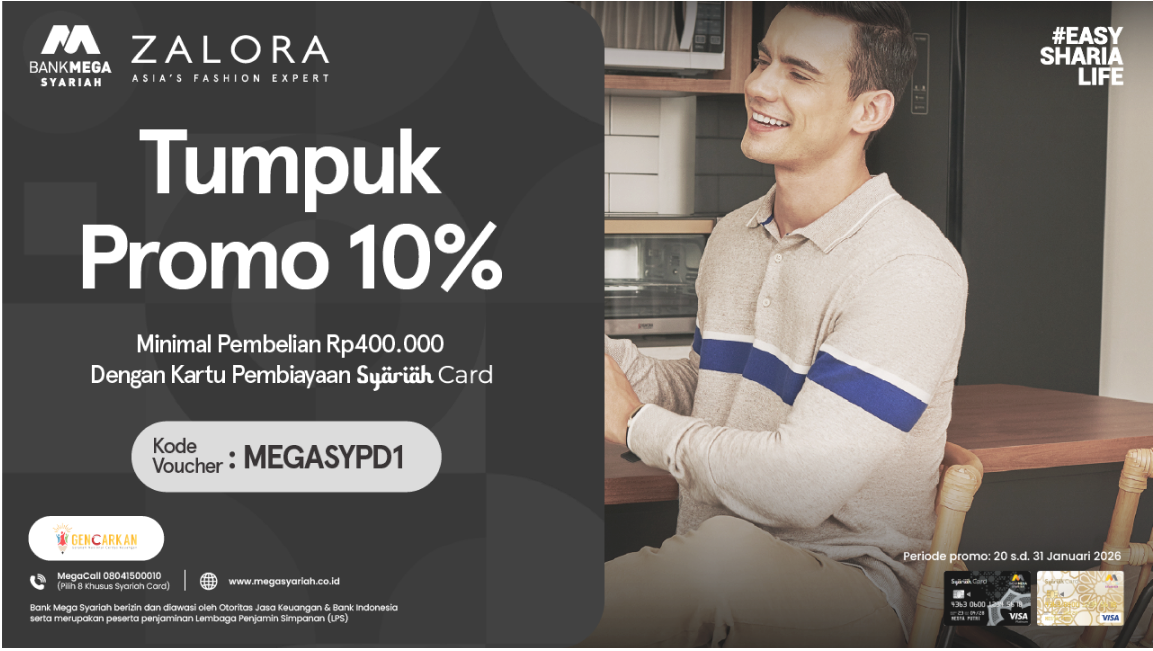 Nikmati diskon tambahan 10% khusus untuk pengguna Syariah Card Platinum & Syariah Card Gold. Dengan diskon ini, kamu bisa belanja berbagai fashion pria dan wanita lengkap dengan diskon maksimal Rp100.000 menggunakan kode MEGASYPD1 pada halaman checkout di aplikasi atau website ZALORA.