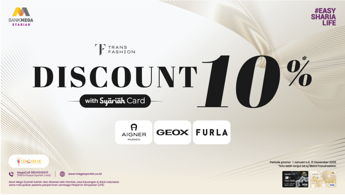 Yuk langsung ke outlet terdekat di kotamu dan jangan lewatkan kesempatan untuk mendapatkan produk-produk high-end di Trans Fashion menggunakan Kartu Pembiayaan Syariah (Syariah Card) dari Bank Mega Syariah.