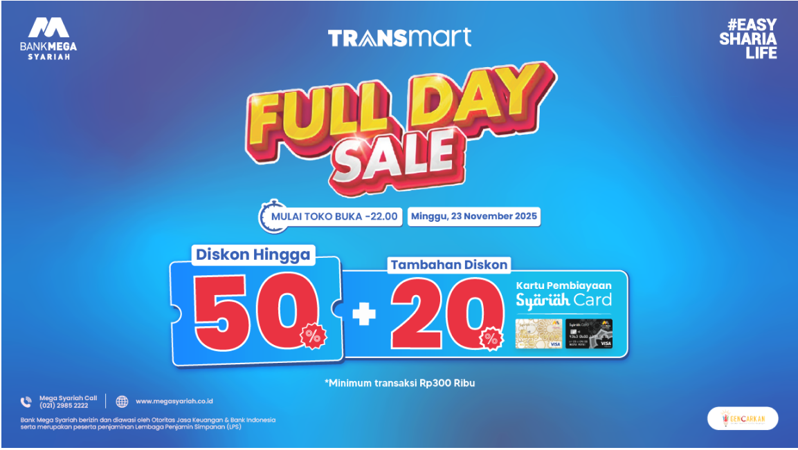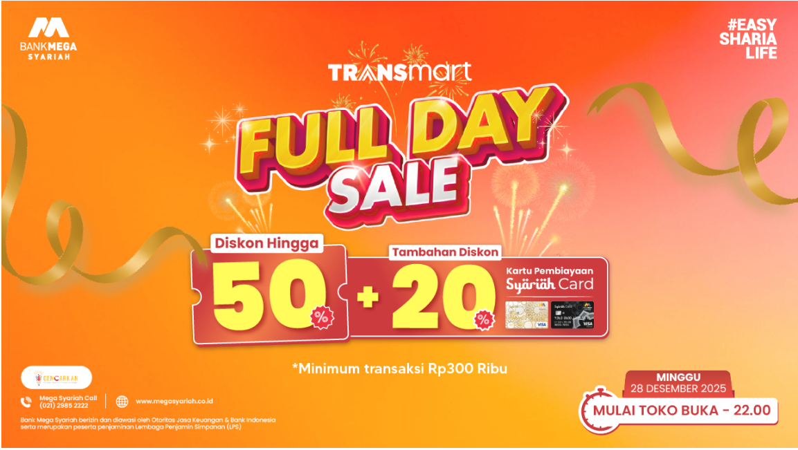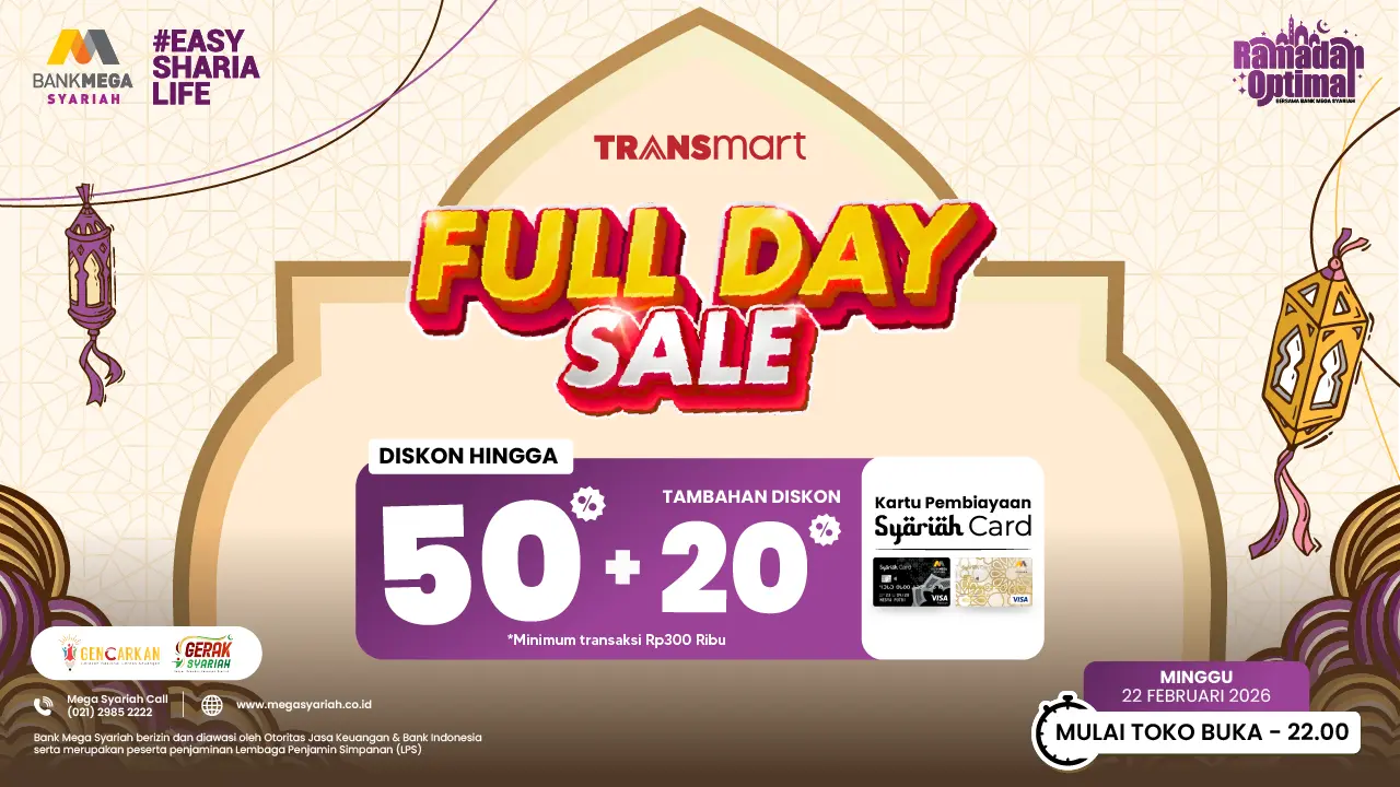 Akhir pekan, waktunya berburu promo buat belanja kebutuhan rumah tangga dan barang-barang incaranmu di Transmart Full Day Sale! Nikmati diskon 50% plus tambahan 20% dengan menggunakan Syariah Card.
